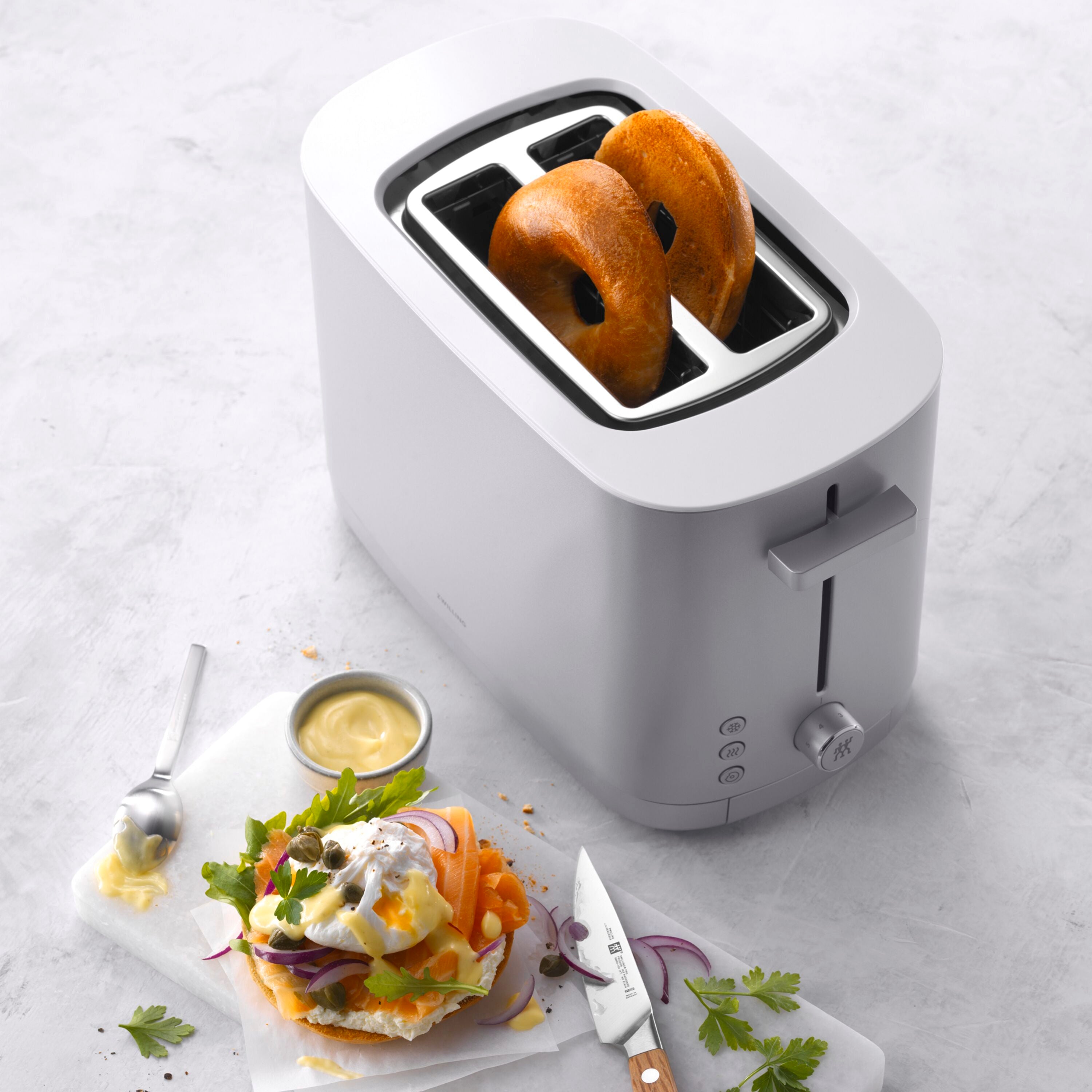 Enjoy your toast precisely how you like it. Every time. The premium toaster for two slices in modern ZWILLING design always ensures evenly brown toast even over repeated toasting. It does so by automatically shortening the toasting duration to achieve the desired browning. The 1000 watt toaster's four separate heating elements evenly toast both sides of every slice. The result is crispy on the outside and soft on the inside – authentic ZWILLING toast.   When it's finished, toast doesn't fly out of the toaster. The soft-lift feature ensures they gently glide up and the built-in extra-lift feature allows even smaller slices to be removed easily from the toaster. Never burn your toast again: This toaster automatically switches off when the preset toasting duration is reached. Even when set to high, toast is never toasted to more than dark brown. The stop button also allows you to instantly stop toasting at any time. Crumbs fall into the easy-to-remove crumb tray. The toaster features seven browning levels as well as three automatic programmes. The warm up feature allows you to reheat cold toast. The thaw feature allows you to toast frozen bread direct from the freezer. And the bagel feature with slice centring allows you to achieve ideal bagel toasting results: crispy on the outside, toasted on the inside. The removable bread roll attachment also allows two additional rolls to be warmed or toasted. Moreover, the bread roll attachment features symmetrically arranged crossbars that also make it ideal as a serving plate for your toast.